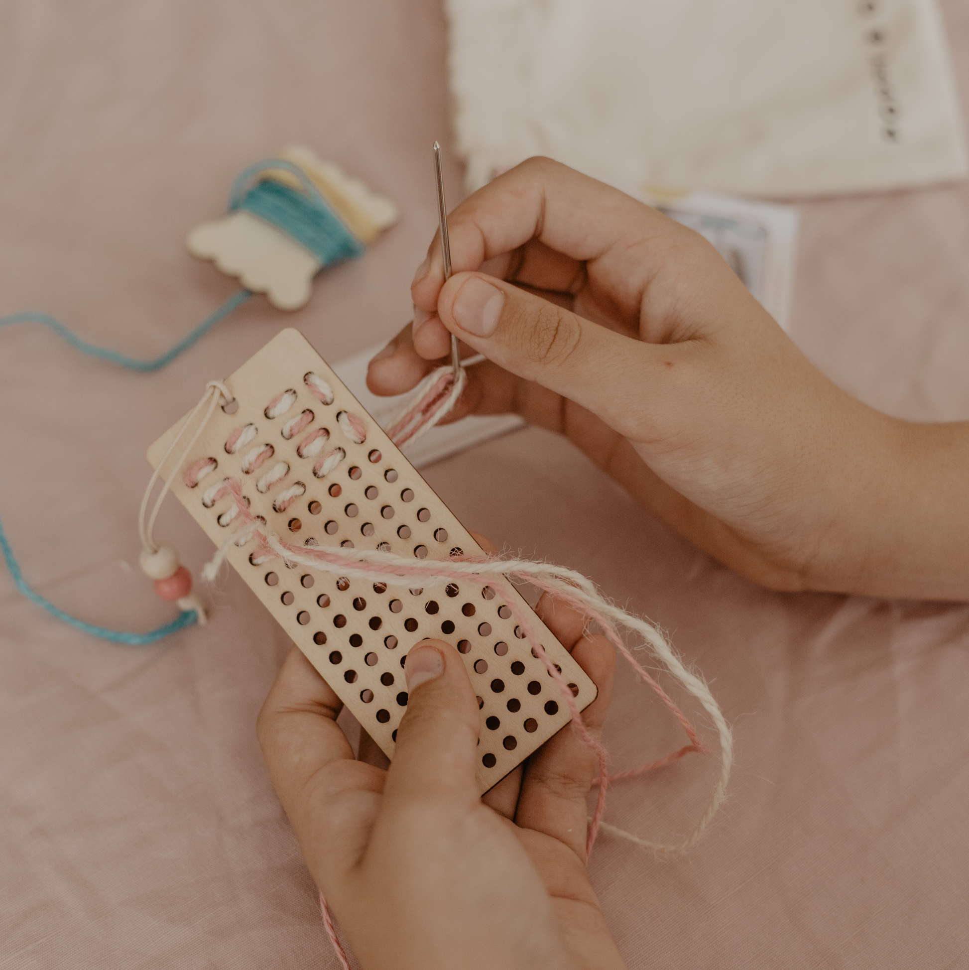 Children will love designing and making their own bookmark to use. Pick from any of the 4 colours of natural hemp string and create your own pattern. Comes with a big blunt needle to thread in and out of the holes in the bookmark. A fun mindful activity that is great to do anywhere and with little clean up!